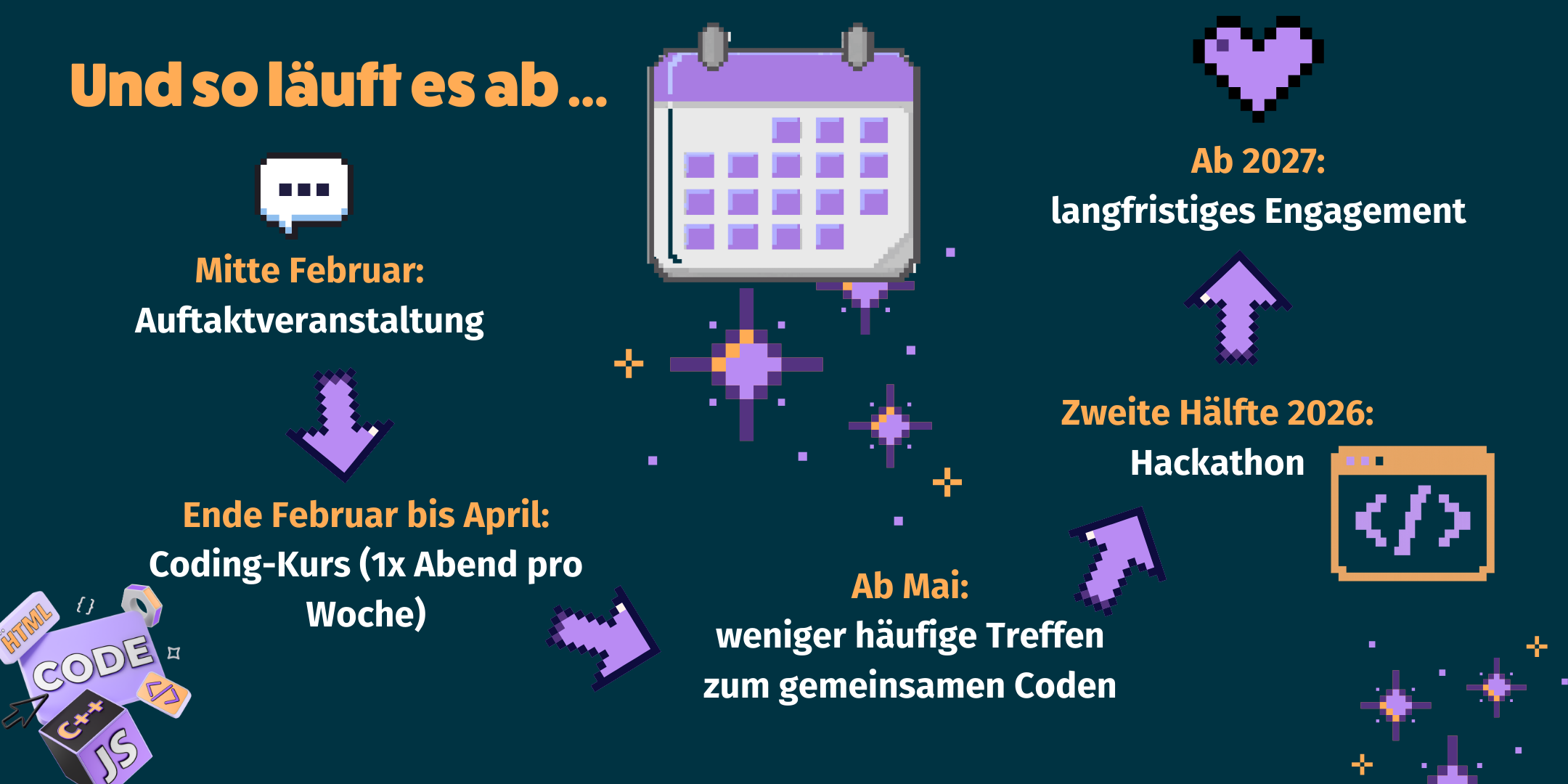 Als Teil des Technikteams erhältst du zunächst einen Crashkurs im Coden mit dem Schwerpunkt Web-Development. Dieser wird von unserer aktuellen Technikperson durchgeführt. Es ist keine Vorerfahrung notwendig. Da wir von und miteinander lernen wollen, sind Personen mit Vorwissen herzlich willkommen. Der Kurs soll als Abendschule ab Ende Februar einen Abend die Woche für ca. 8 bis 10 Wochen stattfinden. Danach werden wir die Häufigkeit der Treffen reduzieren. Zusätzlich haben wir Budget, um individuelle Fortbildungen zu ermöglichen.