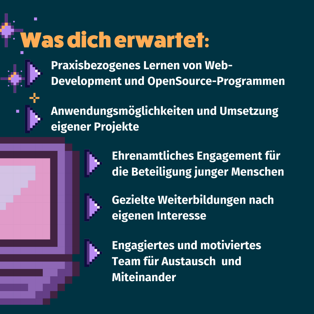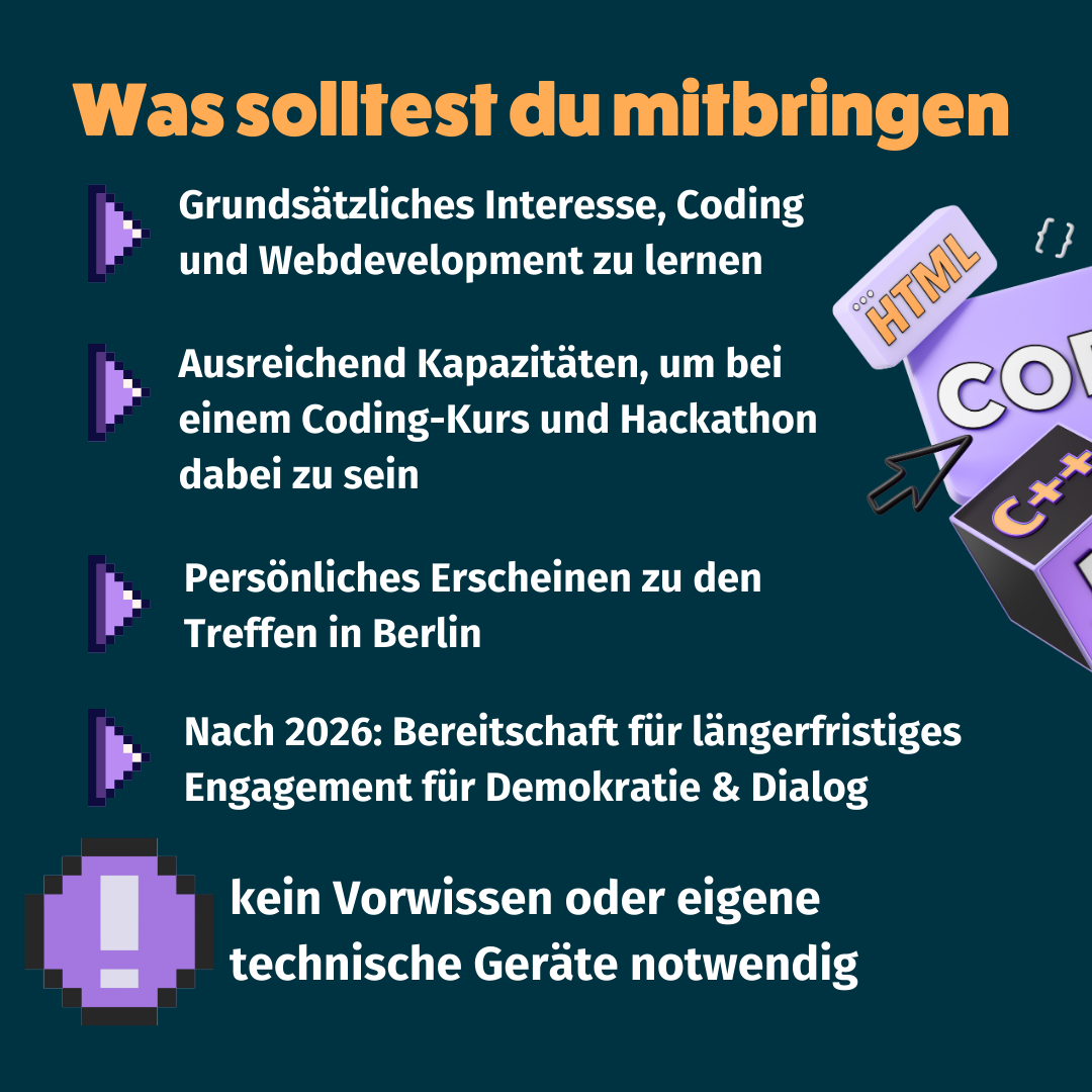 Demokratie & Dialog e.V. sucht ein motiviertes Technikteam, welches ehrenamtlich die digitale Infrastruktur des Vereins betreut. Es sind keine Vorkenntnisse nötig! Wir bieten im Jahr 2026 eine eigenene Qualifizierungsreihe zu Webdevelopment und Open-Source-Programmen an. Wenn du Lust hast, Kompetenzen in diesem Bereich zu entwickeln und langfristig im Verein anzuwenden, bist du genau richtig im Techikteam.